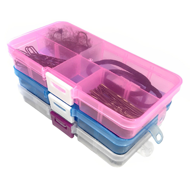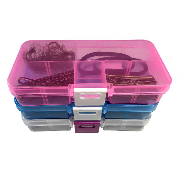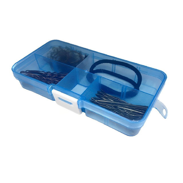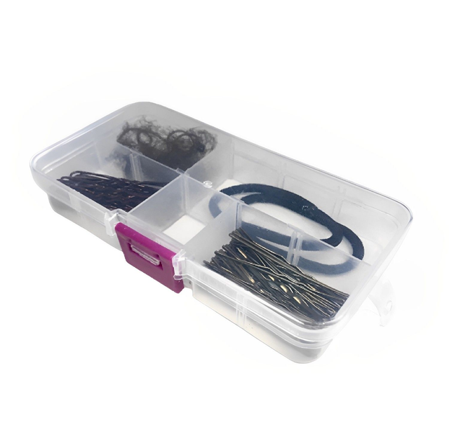 Inclui: 20x Ganchos fechados castanhos; 20x Ganchos abertos castanhos; 1x Rede de cabelo reforçada castanha; 2x Elásticos grossos pretos; 4x Mini elásticos de borracha coloridos; 1x Caixa com divisórias